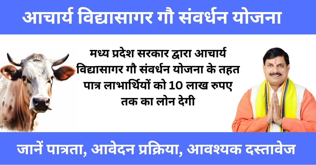 मध्य प्रदेश सरकार द्वारा आचार्य विद्यासागर गौ संवर्धन योजना के तहत पात्र लाभार्थियों को 10 लाख रुपए तक का लोन देगी। यह योजना राज्य मे पशुपालक का भविष्य उज्जवल बनाने और रोजगार शुरू करने के लिए पशुपालन को प्रोत्साहित करेंगी। जिससे राज्य में दुग्ध उत्पादन में वृद्धि होगी। इस योजना का लाभ प्राप्त करने हेतु ऑफलाइन प्रक्रिया के माध्यम से आवेदन कर सकते हैंं।