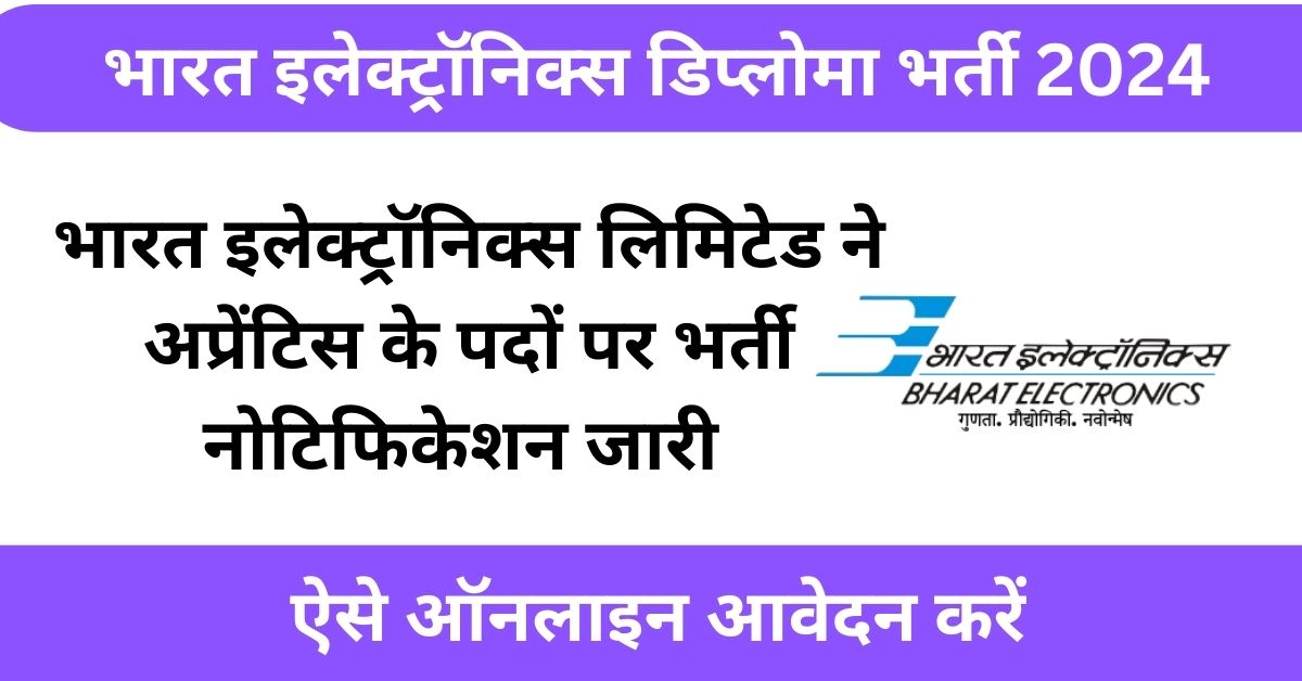 Bharat Electronics Limited Vacancy 2024 :- भारत इलेक्ट्रॉनिक्स लिमिटेड (BEL) ने 90 डिप्लोमा अप्रेंटिस की भर्ती के लिए आधिकारिक अधिसूचना जारी की है। इस भर्ती के माध्यम से मैकेनिकल इंजीनियरिंग, इलेक्ट्रॉनिक्स, कंप्यूटर साइंस और अन्य सहित विभिन्न विषयों में भरे जाएंगे। इस भर्ती के लिए 4 नवंबर, 2024 तक आवेदन स्वीकार किए जा रहे हैं।