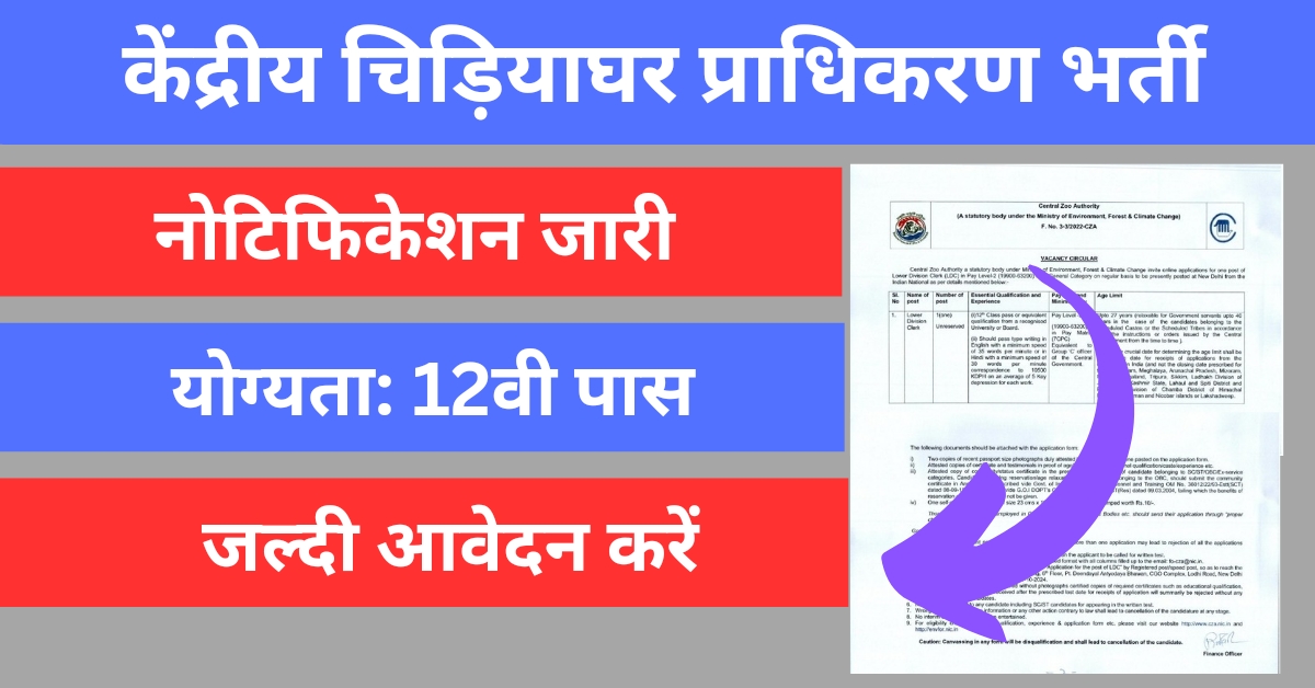 Central Zoo Authority Vacancy 2024 :- केंद्रीय चिड़ियाघर प्राधिकरण, पर्यावरण, वन और जलवायु परिवर्तन मंत्रालय के तहत एक वैधानिक निकाय है यह निकाय नियमित रूप से विभिन्न पदों पर भर्ती के लिए नोटिफिकेशन जारी किया है इस भर्ती के माध्यम से एलडीसी (लोअर डिविजन क्लर्क) के पद पर भर्ती के लिए आवेदन आमंत्रित किए गए हैं।