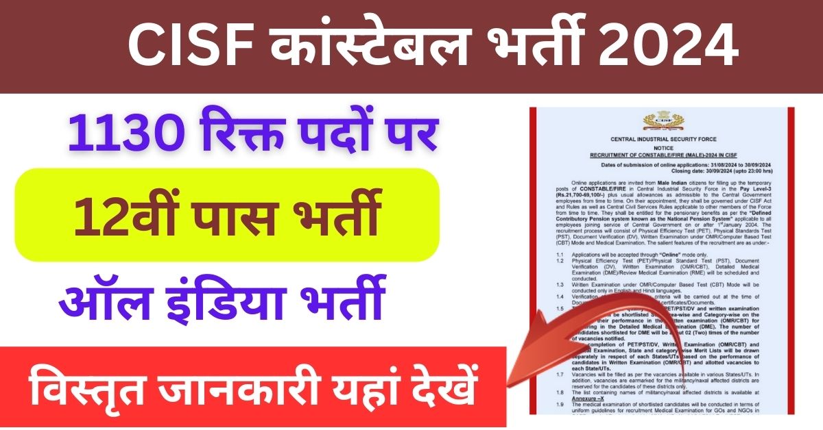 CISF Constable Vacancy 2024 : 12वीं पास के लिए खुशखबरी, CISF में निकली 1130 पदों पर भर्तियां, सैलरी 69000 से अधिक