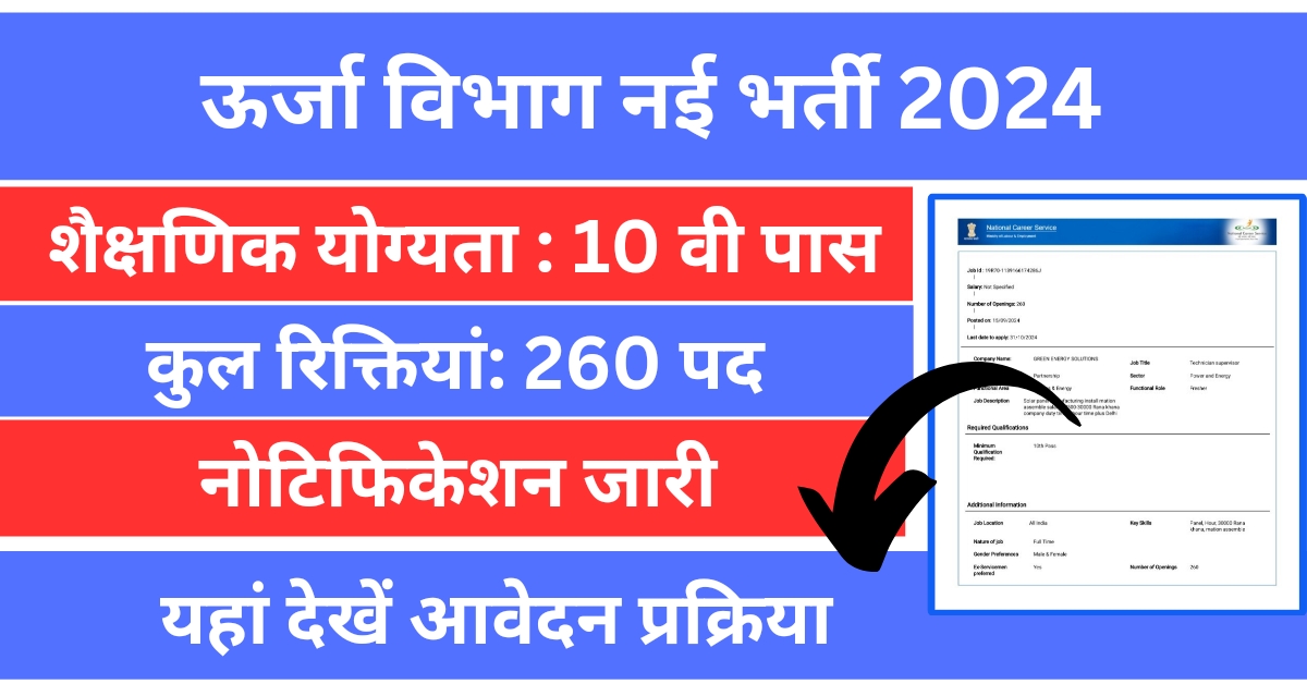 ऊर्जा विभाग ने तकनीशियन सुपरवाइजर के 260 पदों पर भर्ती के लिए नोटिस जारी कर दिया है। 18 से 28 वर्ष के बीच के उम्मीदवारों के लिए यह सुनहरा अवसर है, खासकर अगर आपने 10वीं पास कर ली है। जल्द से जल्द आवेदन करें और सरकारी नौकरी का सपना साकार करें! ध्यान रहे, आवेदन की अंतिम तिथि 31 अक्टूबर 2024 है, आवेदन प्रक्रिया स्टेप बाय स्टेप नीचे दिया गया है जिनको फॉलो कर आसानी से आवेदन कर सकते हैं।