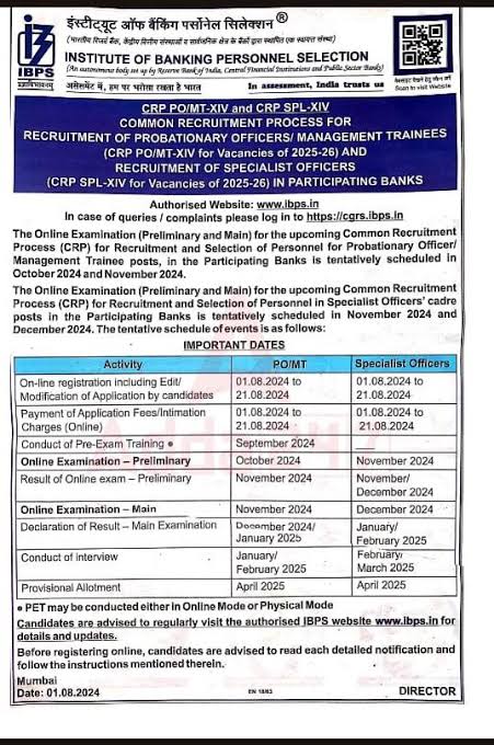 आईबीपीएस ने प्रोबेशनरी ऑफिसर या मैनेजमेंट ट्रेनी के 4455 पदों पर भर्ती के लिए नोटिफिकेशन जारी किया गया है। इस भर्ती परीक्षा के लिए पुरुष और महिला दोनों ही योग्य है और जिन्होंने भी ग्रेजुएशन कम्पलीट किया हुआ है वह इस भर्ती के लिए पात्र है। लिए आवेदन आज यानी 1 अगस्त 2024 दिन गुरुवार से शुरू होंगे और कुछ ही देर में रजिस्ट्रेशन लिंक एक्टिव कर दिया जाएगा।