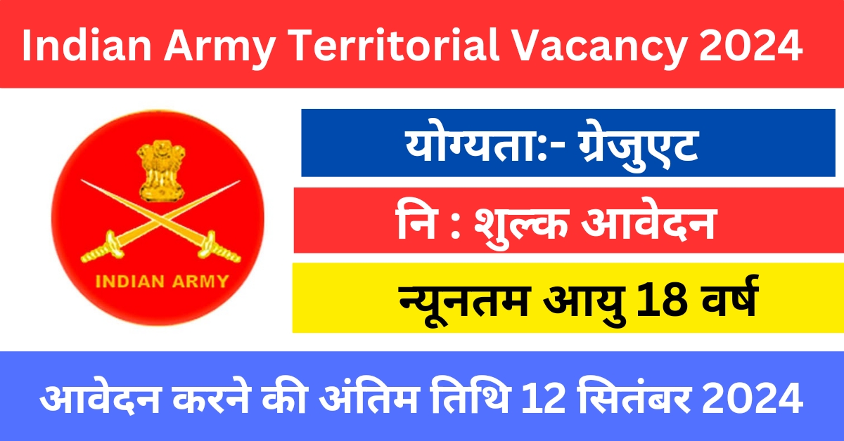 टेरिटोरियल आर्मी ऑफिसर भर्ती के लिए आवेदन प्रक्रिया 15 जुलाई से शुरू हो गई है। आवेदन करने की अंतिम तिथि 12 सितंबर रखी गई है। इस आर्टिकल में हम आपको Indian Army Territorial Vacancy 2024 से सबंधित सभी जानकारी प्रदान करने वाले हैं तो आप इस लेख को अंतिम तक अवश्य पढ़े।