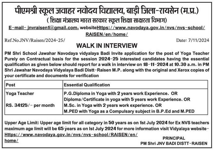 - इंटरव्यू का स्थान: पीएमश्री स्कूल जवाहर नवोदय विद्यालय, बाड़ी जिला-रायसेन (म.प्र.)