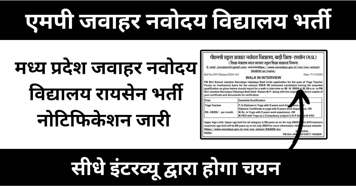 Jawahar Navodaya Vidyalaya Vacancy 2024:- यदि आप नौकरी की तैयारी कर रहे हैं तो आपके लिए खुशखबरी हैं क्योंकि हाल ही में मध्य प्रदेश जवाहरलाल नवोदय विद्यालय द्वारा भर्ती नोटिफिकेशन जारी किया गया है। इस भर्ती के माध्यम से आवेदकों का चयन योग टीचर के पदों पर संविदा आधार पर किया जाएगा । मध्य प्रदेश जवाहर नवोदय विद्यालय रायसेन भर्ती के लिए आवेदकों को ऑफलाइन माध्यम से आवेदन करना है।