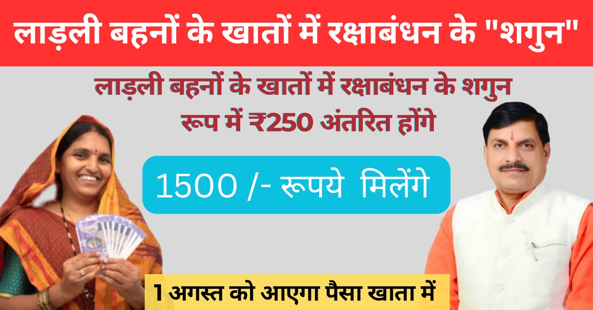 रक्षाबंधन से पहले सभी लाडली बहनों को ₹250 रक्षाबंधन उपहार के रूप में 1 अगस्त को प्रदान किए जाएंगे। आप 1 अगस्त को अपना बैंक खाता जाकर यह राशि चेक कर सकती हैं, यह राशि लाडली बहनों को त्योहारों की सामग्री खरीदने हेतु प्रदान की जा रही है, ताकि सभी महिलाएं त्योहारों पर खुशियों से मना सके।