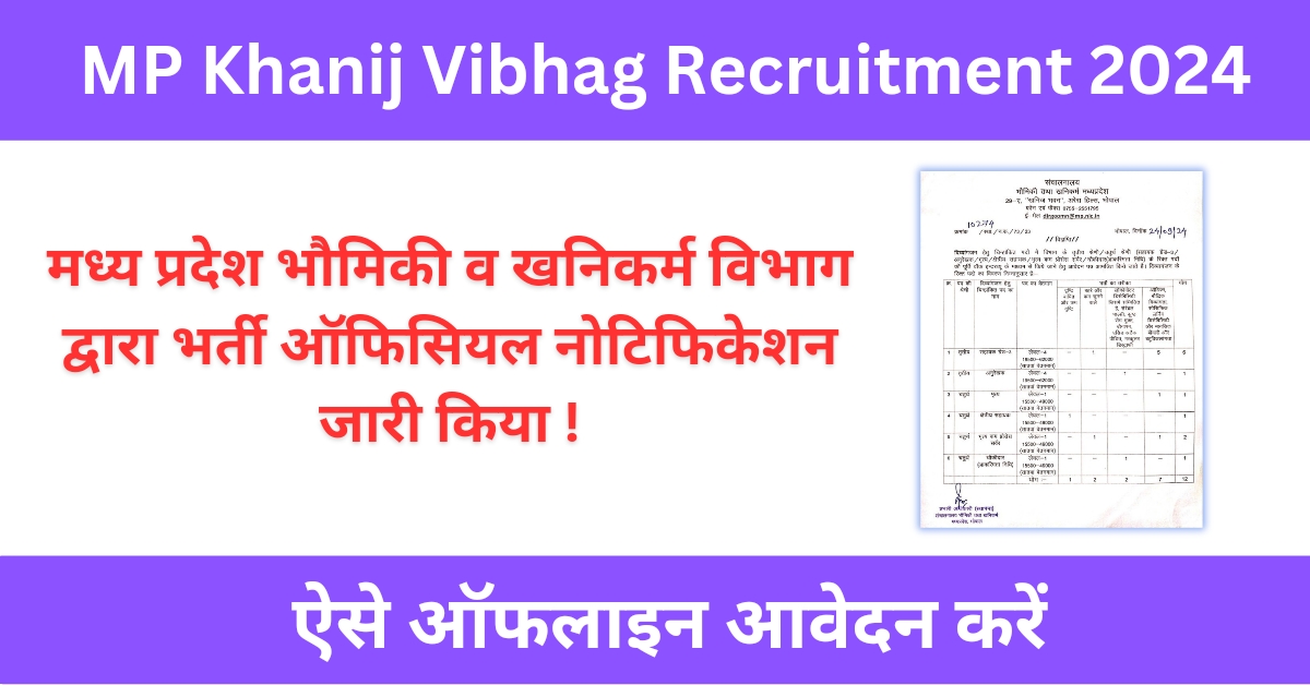 MP Khanij Vibhag Recruitment 2024 :- सरकारी नौकरी की तैयारी कर रहे उम्मीदवार के लिए सबसे अच्छी खुशखबरी क्योंकि हाल ही में मध्य प्रदेश भौमिकी एवं खनिकर्म विभाग द्वारा के सम्बन्ध में ऑफिसियल नोटिफिकेशन जारी किया गया है। इच्छुक उम्मीदवार के लिए एक सुनहरा मौका है। इस भर्ती के माध्यम से उम्मीदवार का चयन विभिन्न पदों पर किया जायेगा।