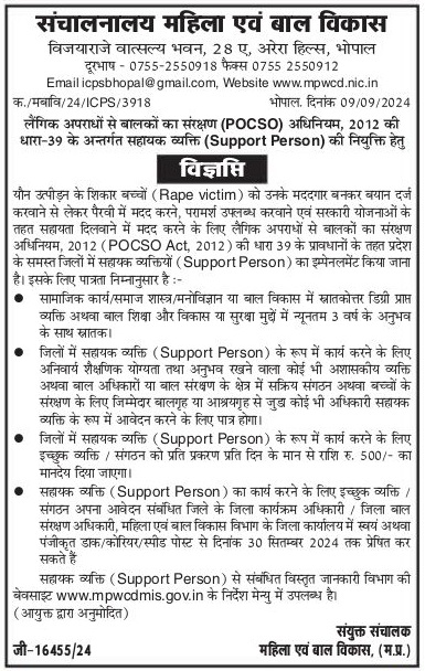 MP WCD Recruitment 2024 :- मध्य प्रदेश महिला एवं बाल विकास विभाग द्वारा भर्ती नोटिफिकेशन जारी किया गया है। इस भर्ती के तहत आवेदक का चयन सहायक व्यक्ति के पदों पर किया जायेगा। विभाग द्वारा लैंगिक अपराधों से बालको का संरक्षण अधिनियम 2012 की धारा 39 के माध्यम से सहायक पद के लिए नोटिफिकेशन जारी किया गया है।