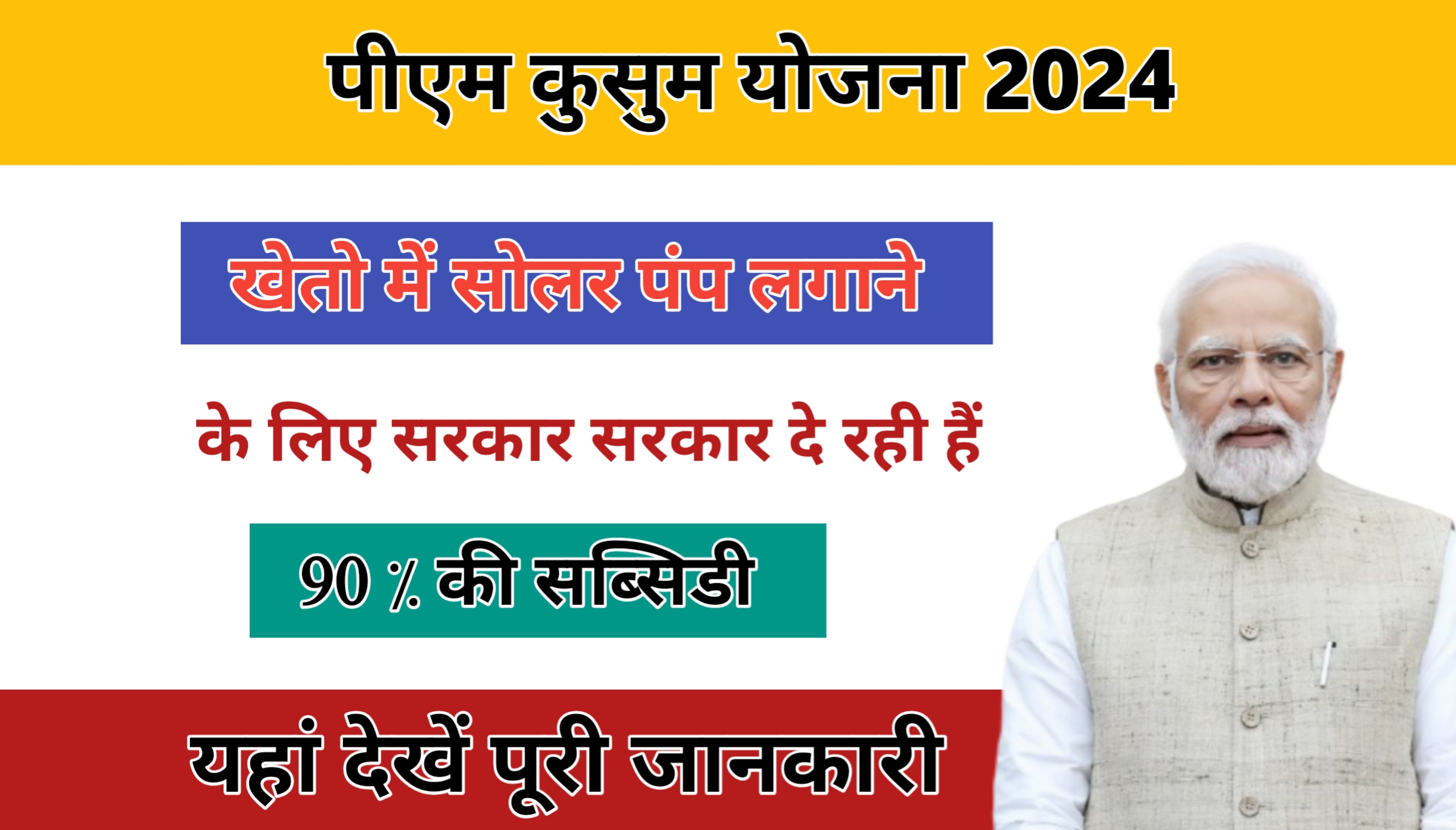 प्रधानमंत्री ने 2019 में प्रधानमंत्री ने कुसुम योजना की शुरुआत की थी इस योजना के तहत, किसानों को सोलर पम्प लगवाने के लिए सब्सिडी प्रदान की जाती है। यह भारत सरकार की एक प्रमुख योजना है जिसके अंतर्गत किसानों को उनके खेतों में सोलर पम्प लगवाने पर 90% की सब्सिडी प्रदान की जाती है।