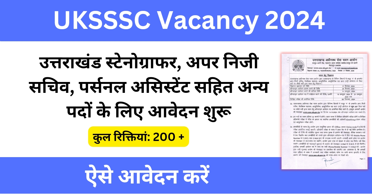 UKSSSC Vacancy 2024 :- उत्तराखंड पब्लिक सर्विस कमीशन (UKPSC) की ओर से एडिशनल प्राइवेट सेक्रेटरी, पर्सनल असिस्टेंट, स्टेनोग्राफर समेत अन्य पदों पर भर्ती नोटिफिकेशन जारी किया है। जिसमें कुल 257 पदों पर भर्ती की जाएगी। इसके लिए 24 सितंबर 2024 से 14 अक्टूबर 2024 तक आवेदन कर सकते हैं।